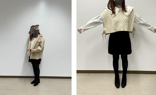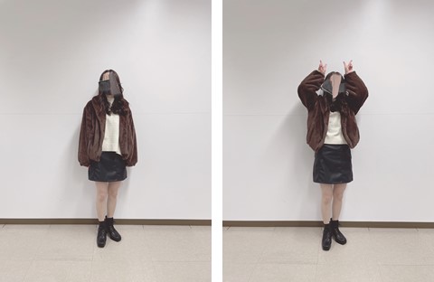 韓国っぽさを出すために全体的に黒で統一感を出しつつ、流行りのもこもこアウターをメインで目立たせながら、白ニットを差し色で入れました