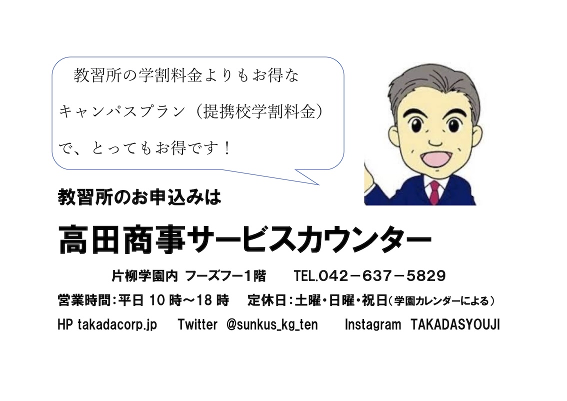 東京工科大学・日本工学院八王子専門学校内フーズフー1階にある高田商事サービスカウンターです。運転免許、卒業衣装、リクルートスーツ等取り扱っております。運転免許はとってもお得なキャンパスプラン、お気軽にご相談ください。私立学校厚生事業連絡会加盟。